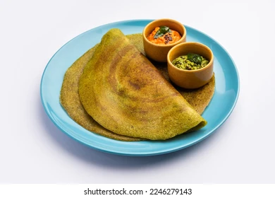• Green gram (moong dal) crepes, sometimes filled with onions and chilies, served with ginger chutney.