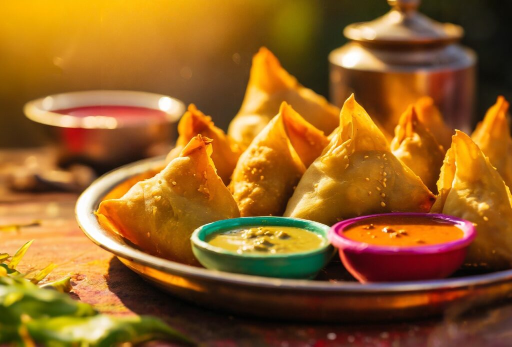• Deep-fried pastry filled with spiced potatoes, peas, and sometimes meat. Often served with tamarind chutney or mint chutney.