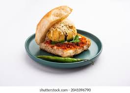 • A spicy potato fritter (vada) sandwiched between a soft bun (pav), often garnished with chutneys and fried green chilies. Mumbai’s iconic street food.